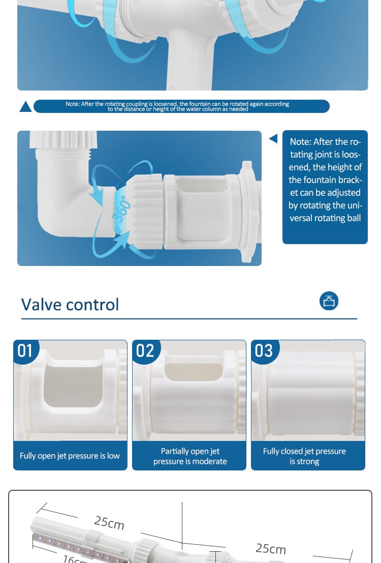 Refreshing Poolside Oasis: Our pool fountain sprayer provides a refreshing and rejuvenating experience by combining the beauty of a fountain with a cooling mist. It creates a cool and inviting ambiance that enhances your poolside oasis.