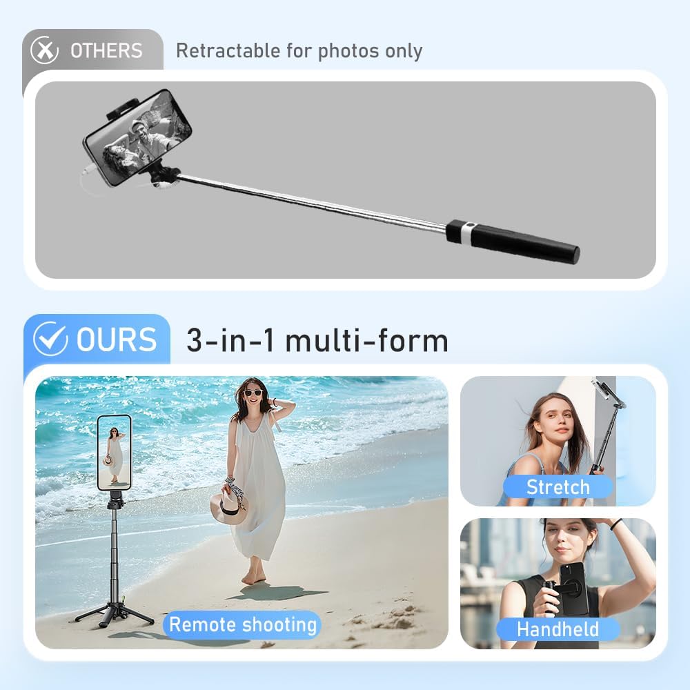 Seamlessly switch between a handheld selfie stick and a stable tripod stand. Its innovative 360-degree rotation capability ensures you can capture every angle – from breathtaking landscapes to perfect group shots and smooth vlogs. No more juggling multiple devices; this one does it all!