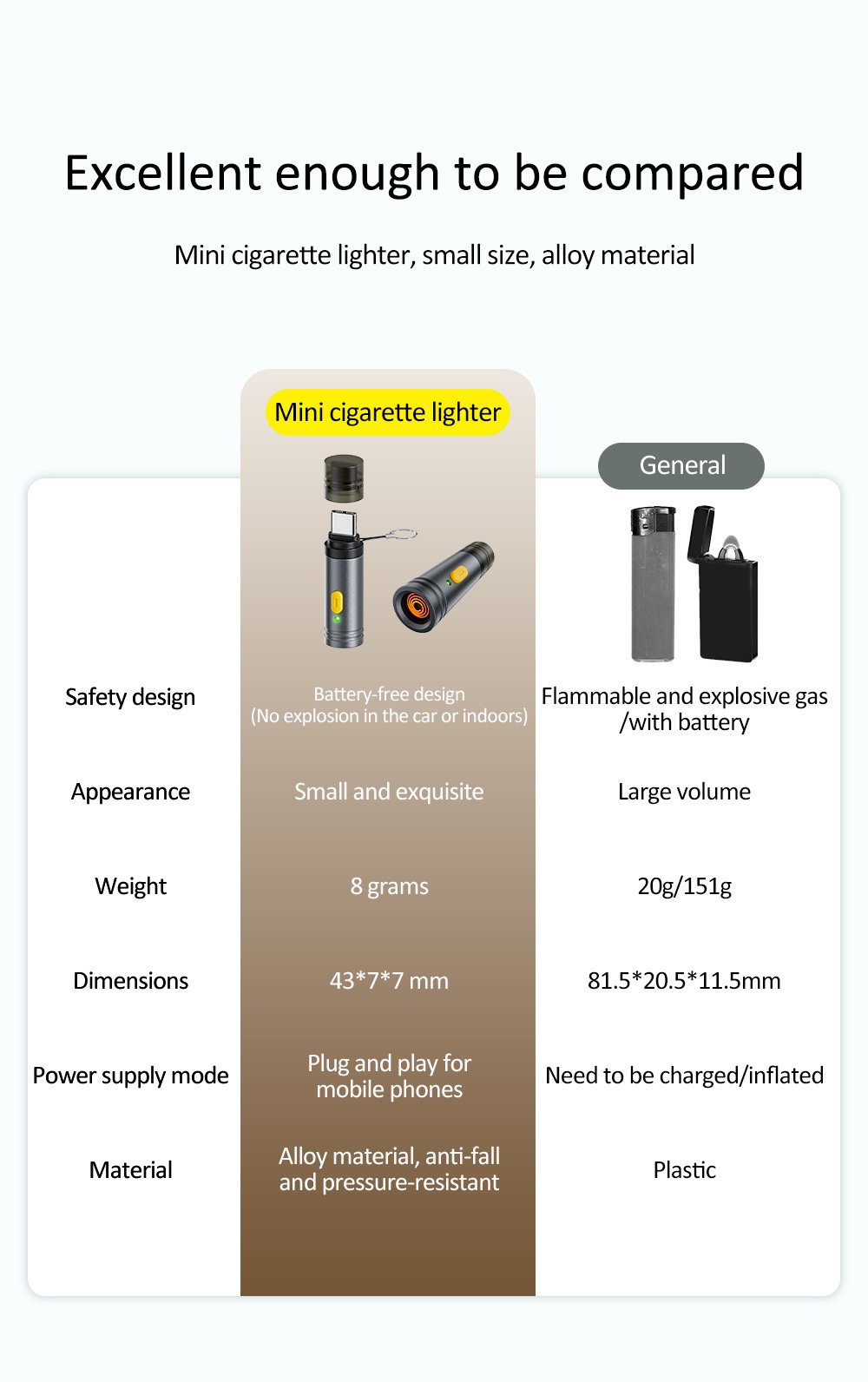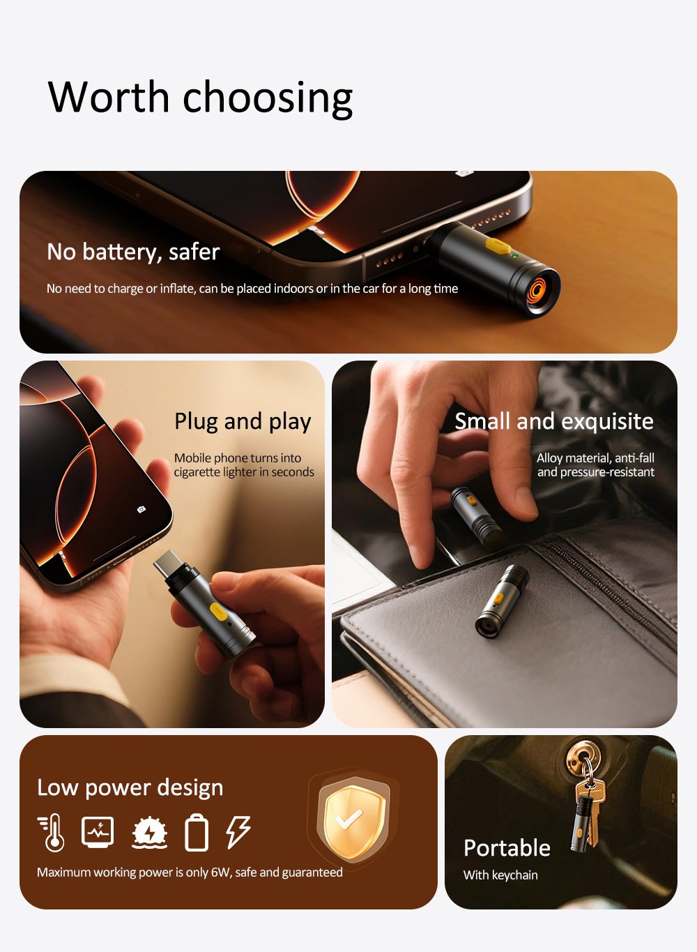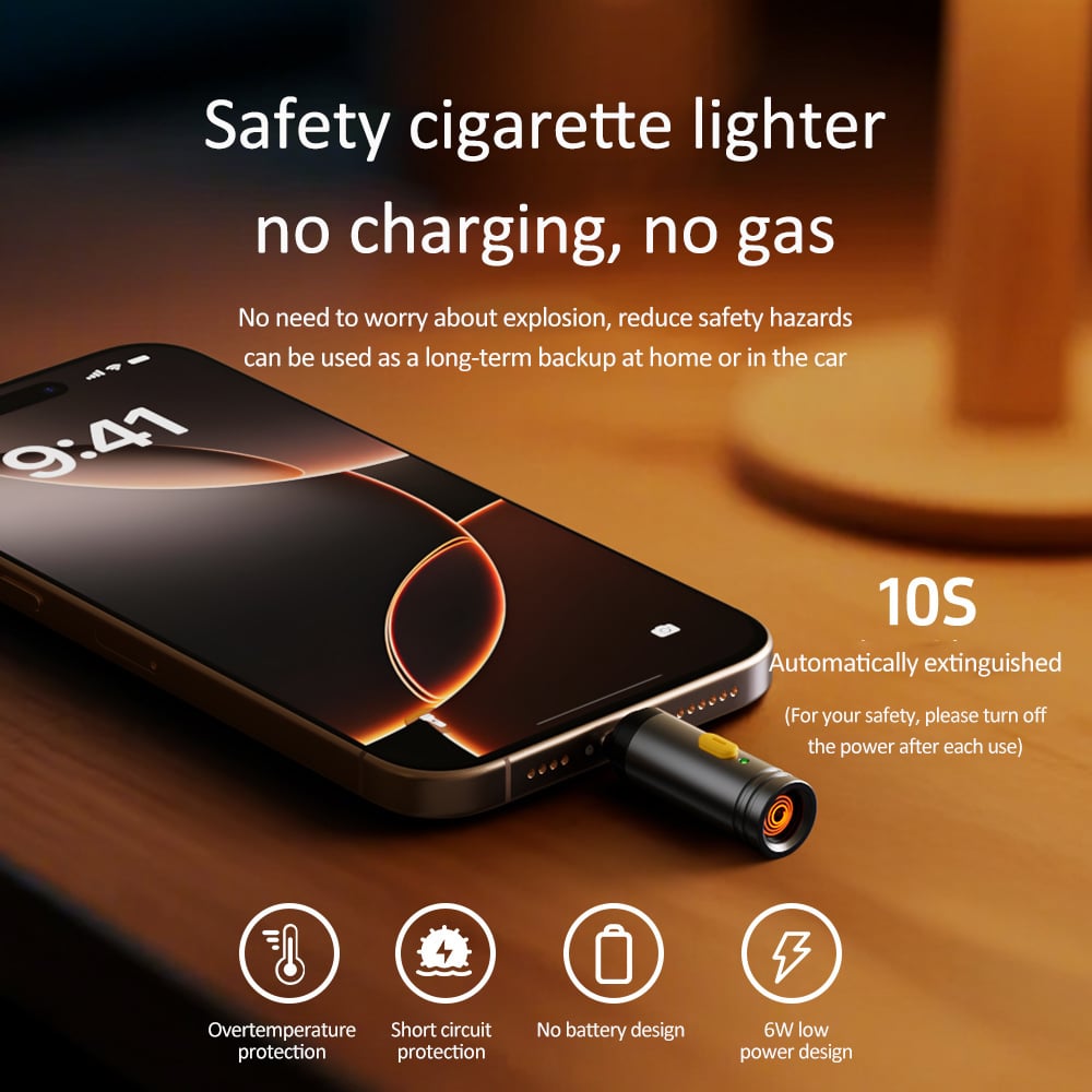 No Charging/Refueling Needed: Directly powered by your phone’s Type-C port, eliminating the hassle of charging or refueling traditional lighters.